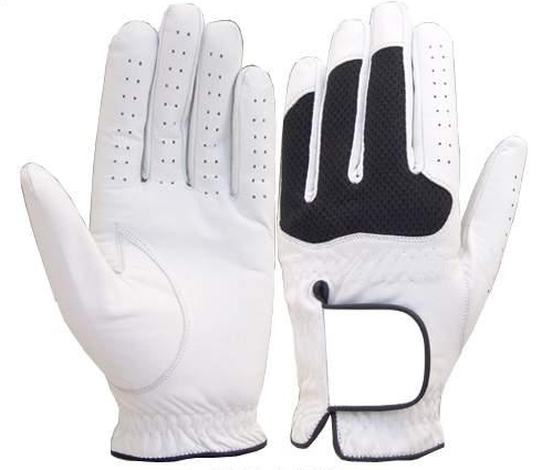 Leather Golf Gloves of High Quality White with Black Back Side Fingers.
